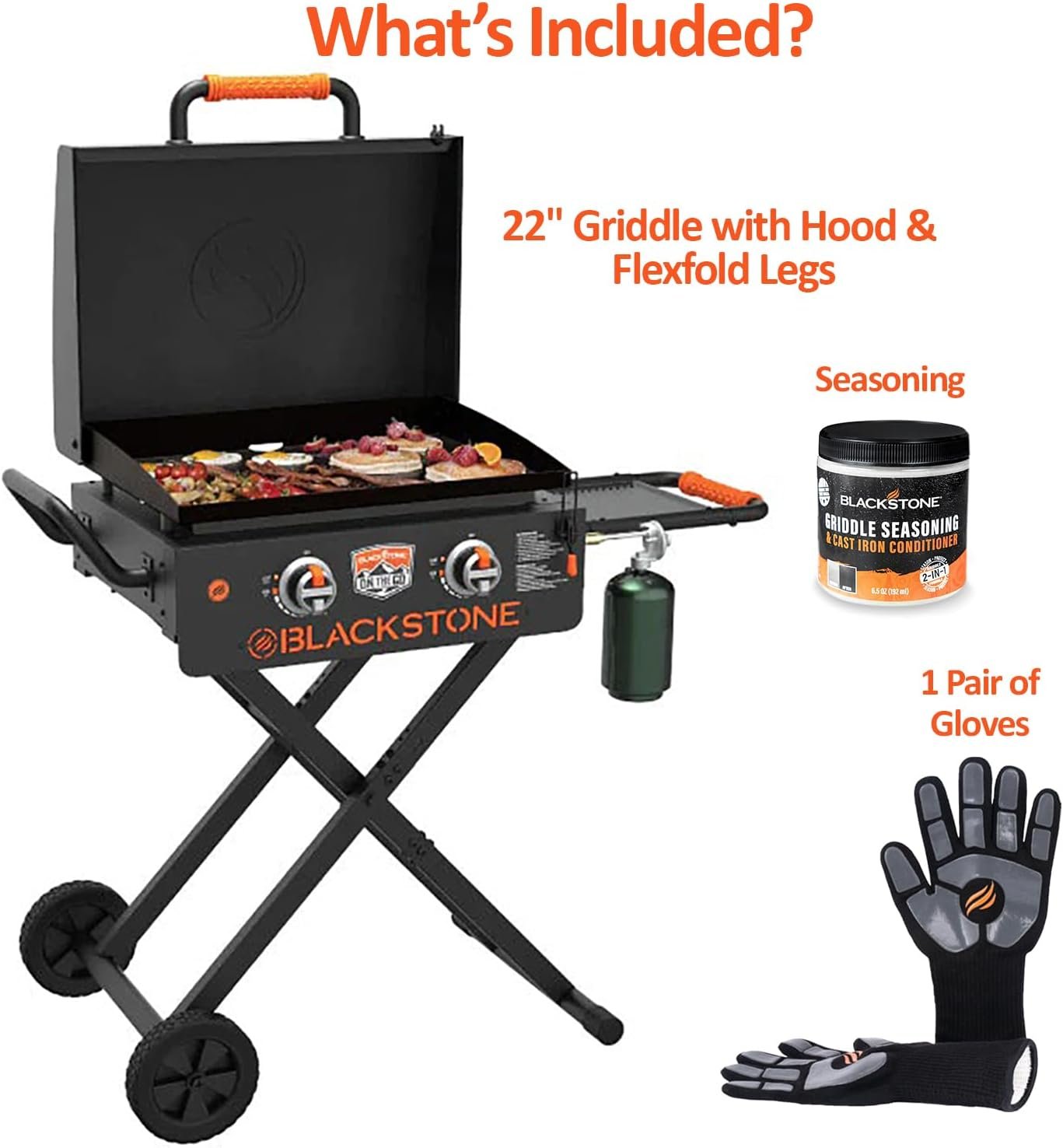 22 Inch Blackstone Griddle with Hood and Grill Stand Foldable Outdoor Flat Top Grill Propane Portable Gas Grill with Seasoning, and Blackstone Gloves Patio, Lawn & Garden