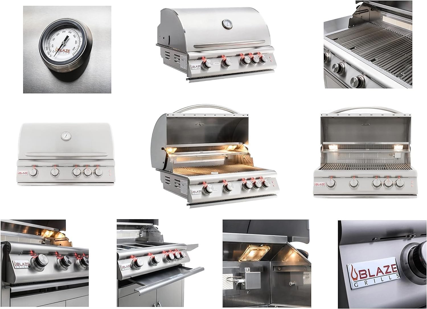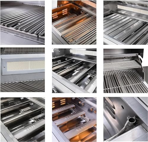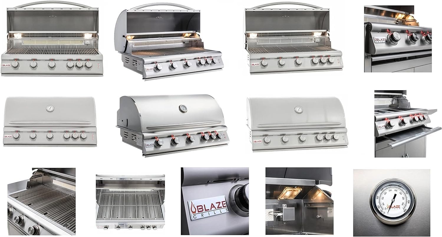 Blaze LTE 40-Inch Gas Grill: A premium outdoor cooking powerhouse with 5 commercial-grade 14,000 BTU 304 stainless steel burners, delivering a total of 70,000 BTUs across 915 sq. in. of cooking surface. Featuring an infrared rear rotisserie burner, LED-illuminated knobs, and interior grill lights for night grilling.