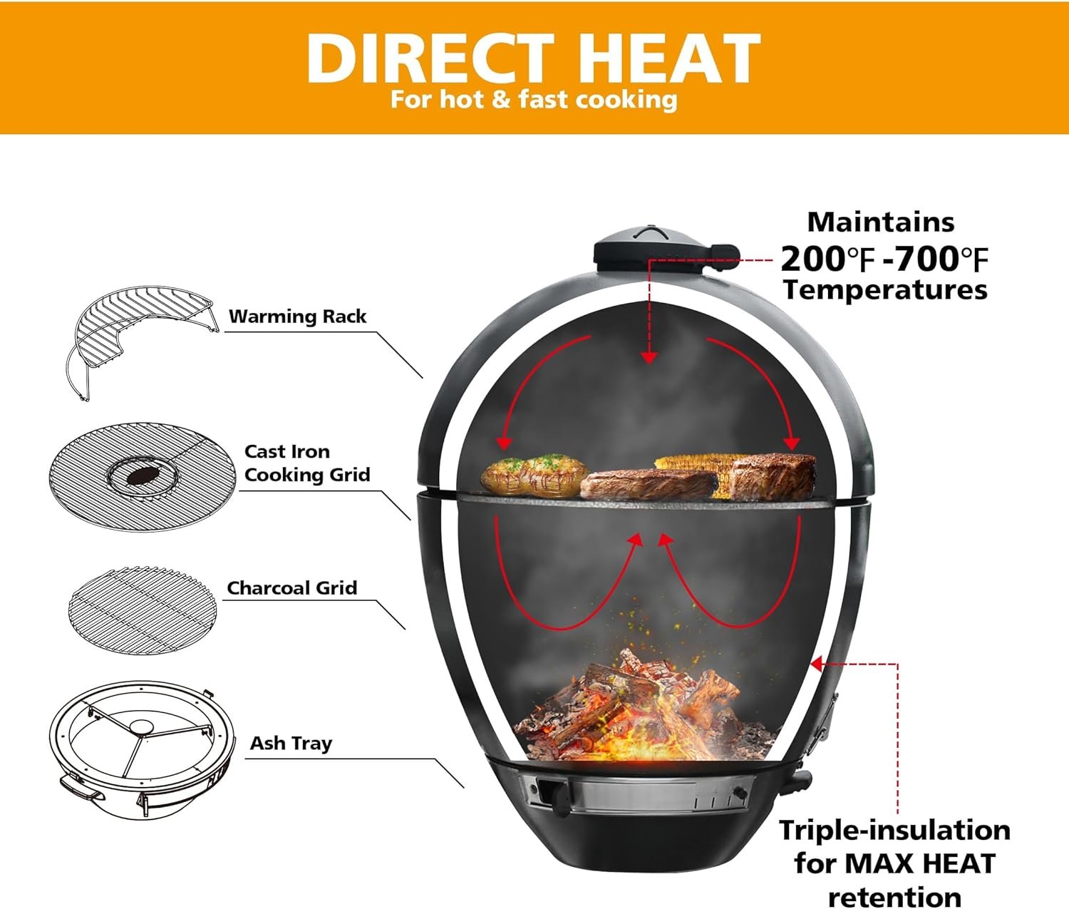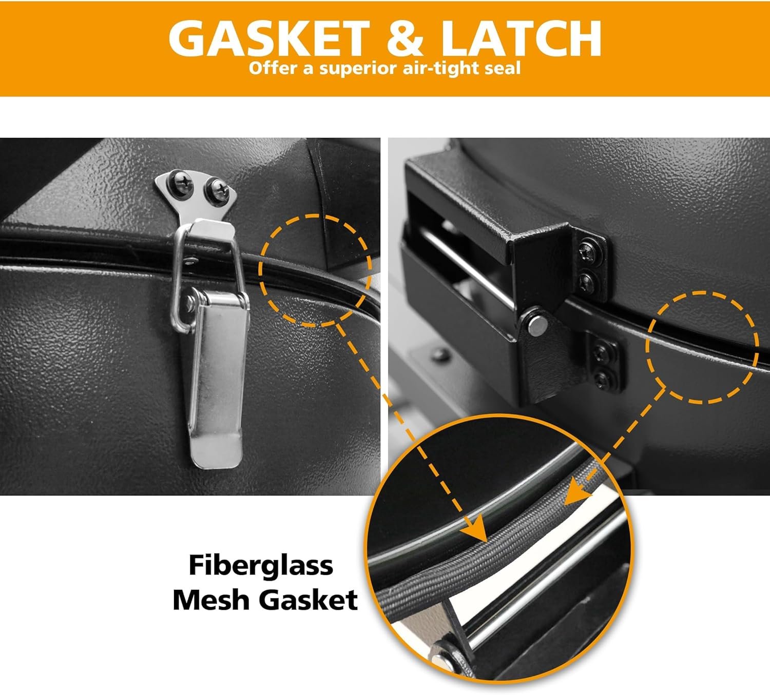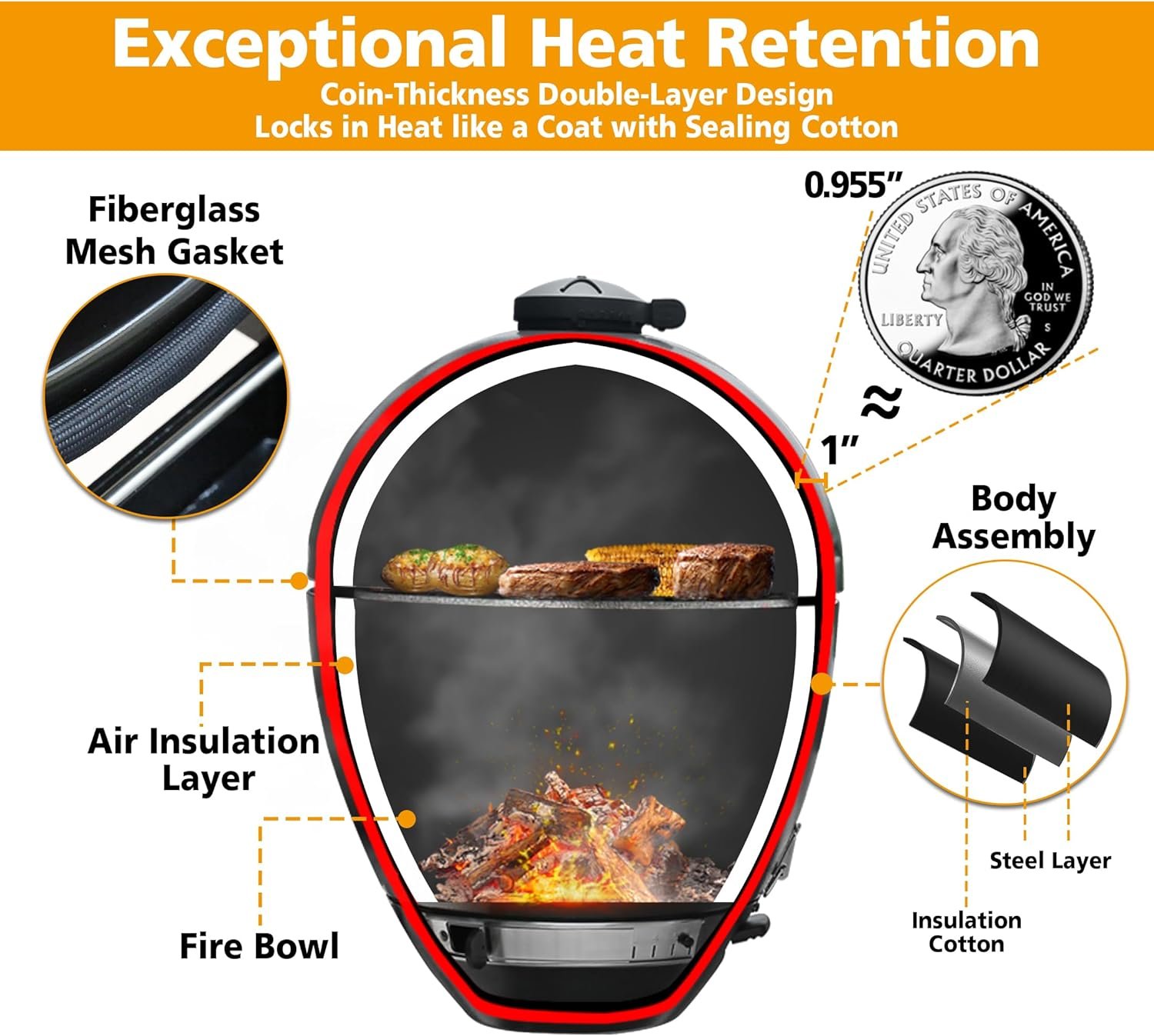 KAMADO CHARCOAL GRILL: Ideal for intense grilling and slow-cooking, our Kamado-style grill feature a coin-thickness double-layer design and mesh fiberglass gasket for superior heat retention, trapping warmth like a cozy coat