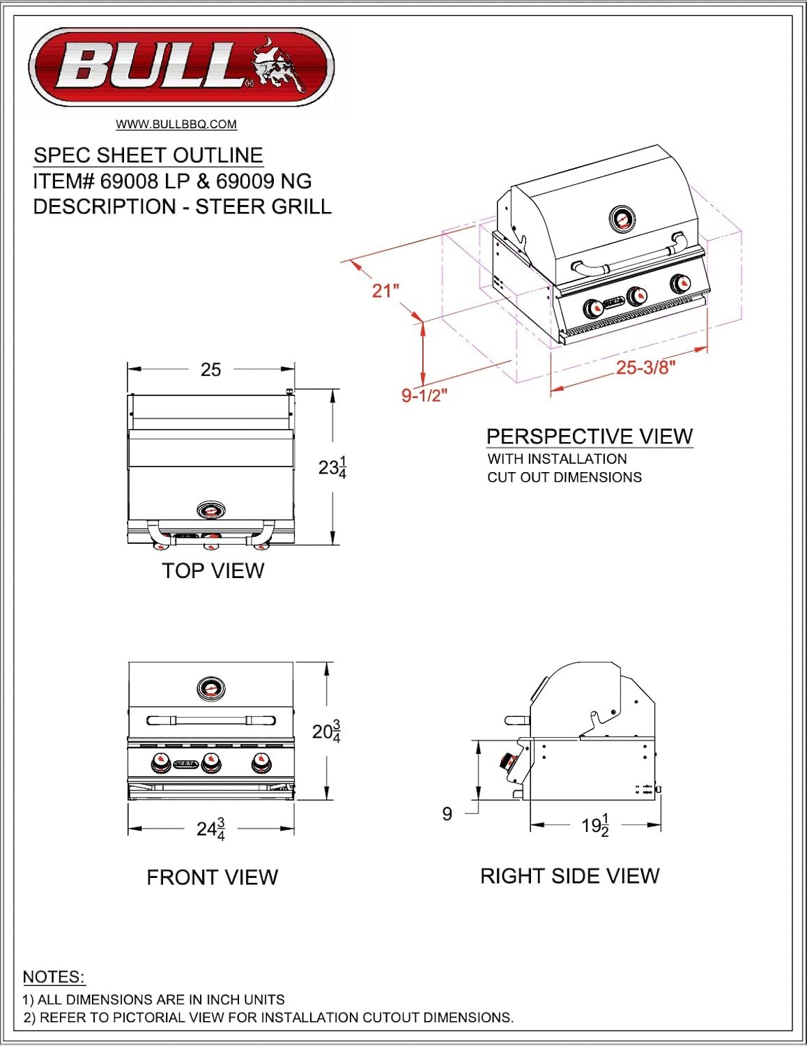 Bull Outdoor Products warrants to the original purchaser that when subject to normal residential use, the grill is free from defects in workmanship and materials for the periods specified. Cast stainless steel burners and cooking grates are warranted for the grill lifetime. Stainless steel flame tamers are warranted for three (3) years. Stainless steel cooking grids, stainless steel frames, and housings have a lifetime warranty. All other components are warranted for one (1) year. |