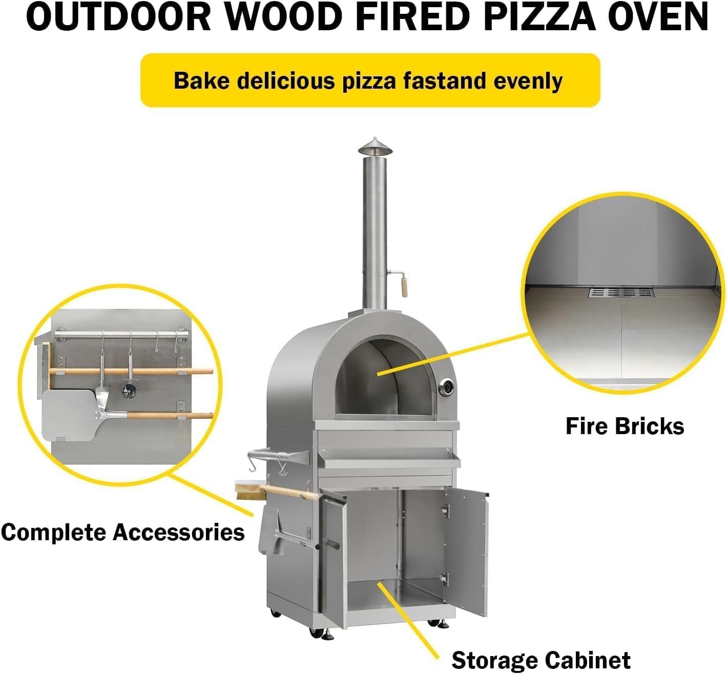 The Outdoor Pizza Oven uses wood-burning to add smokey and savory flavor to any recipe. The included ceramic pizza stone provides excellent cooking versatility. This bottom storage cabinet and removable racks create a storage solution for cleaning supplies and cooking tools.