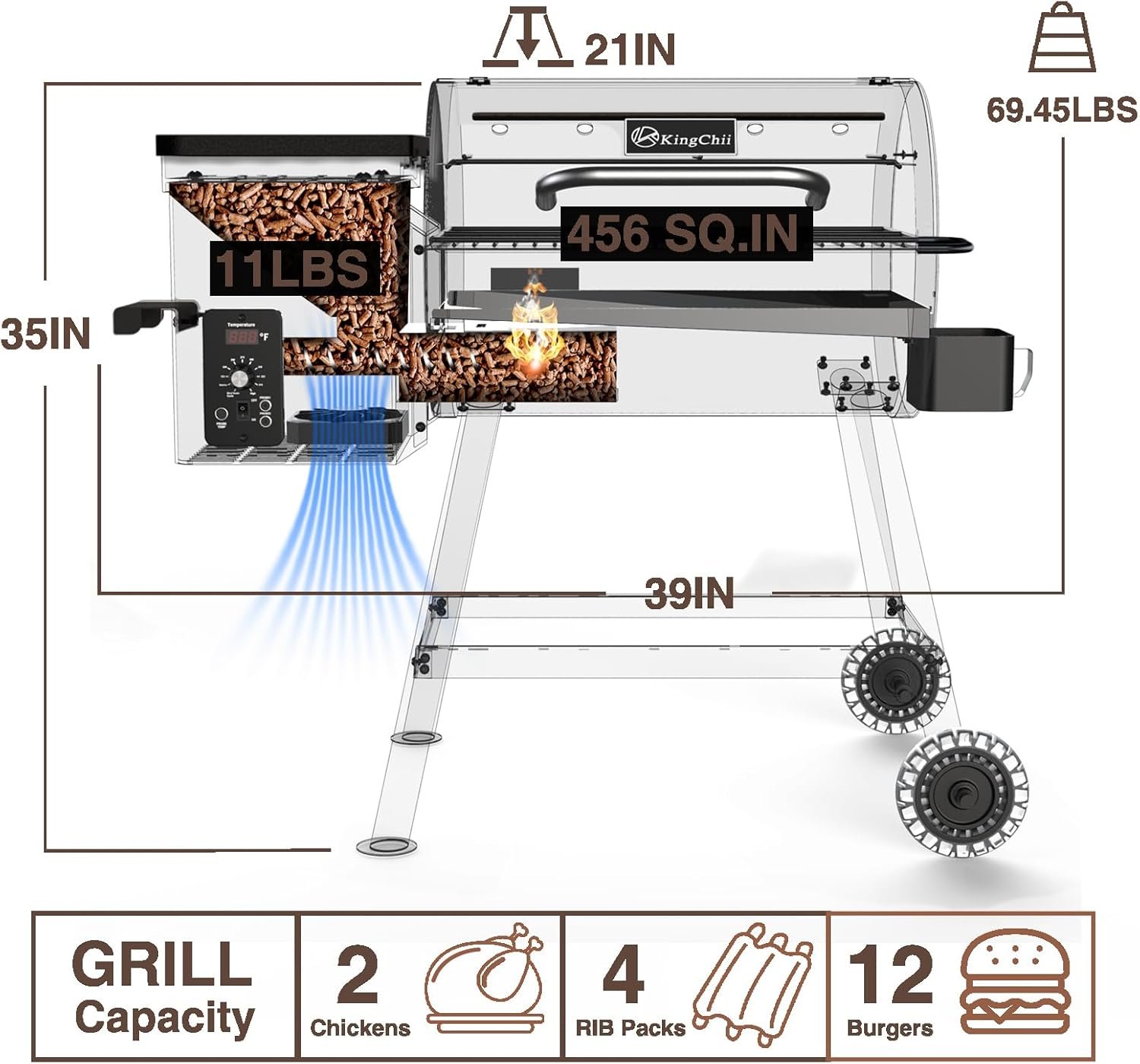 WOOD-SMOKED FLAVOR: With 11-pound hopper capacity, you can enjoy the delicious taste of wood-smoked food. Our grill uses D2 feeding technology and a liftable hopper to save space and ensure longer burning time.