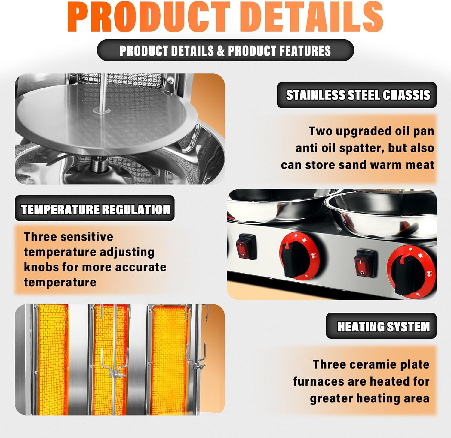 The shawarma grill machine can cook two types of food at the same time such as roasted meat and roasted chicken, 360° auto rotating roast for the kebab during the cooking process. the food can be evenly heated.