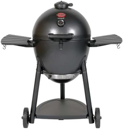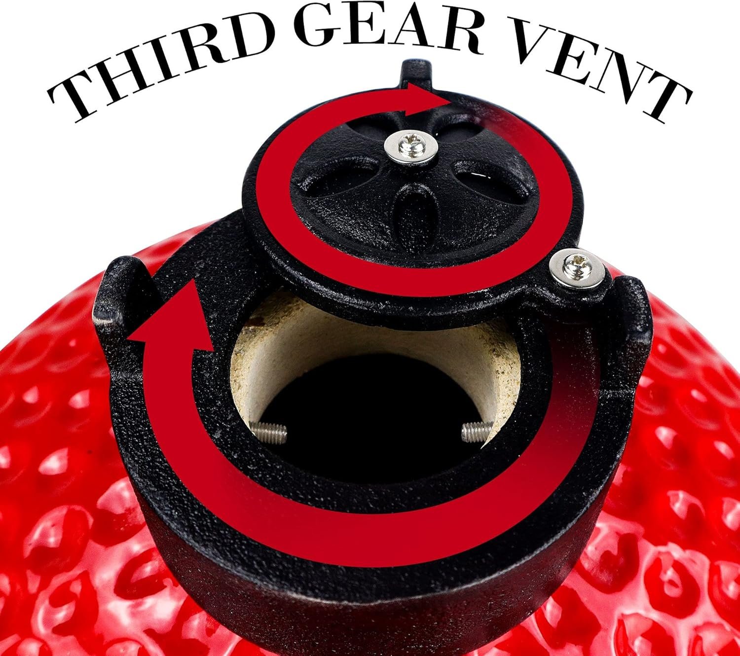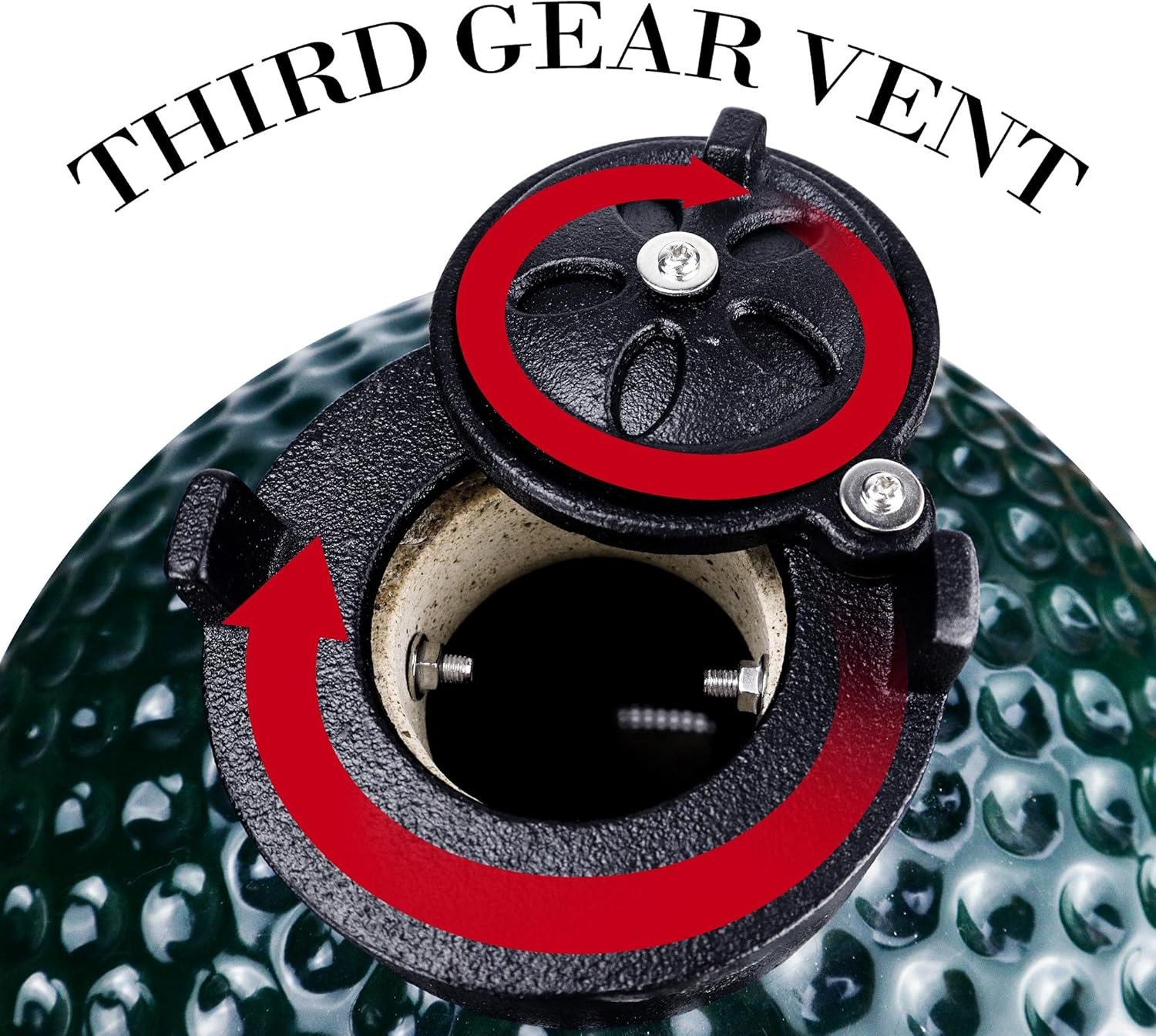 DESIGNED with the griller in mind – Premium glass fiber gasket with thermometer, cast iron top vent, stainless steel bottom vent, inner fire bowl, cast iron charcoal grate, 11” easy clean stainless steel cooking grate.